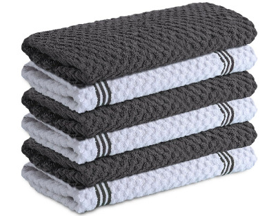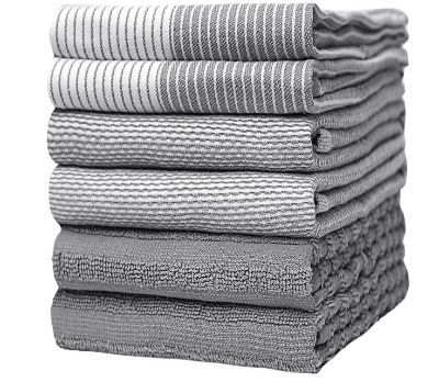The Premium Kitchen Towels set offers a strategic combination of flat and terry cloth designs in an impressive 20 by 28-inch size. This 6-pack delivers substantial coverage with each towel, making quick work of large surfaces and bulky items. The gray color provides a neutral, sophisticated look that complements any kitchen aesthetic while offering practical stain-hiding benefits.