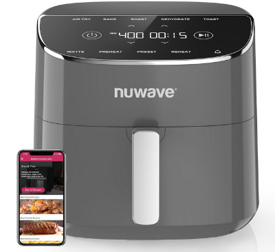 Nuwave’s Brio Plus boasts an 8-quart capacity in cool gray, powered by 1800W for 50°F to 400°F precision. PFAS-free ceramic coating lines the basket, safe and slick for easy release. Seven one-touch functions—air fry, bake, roast, dehydrate, toast, reheat, preheat—pair with 150 presets and 50 memory slots for custom saves. A digital touchscreen adjusts in 5°F increments, and the basket pauses cooking when removed.
